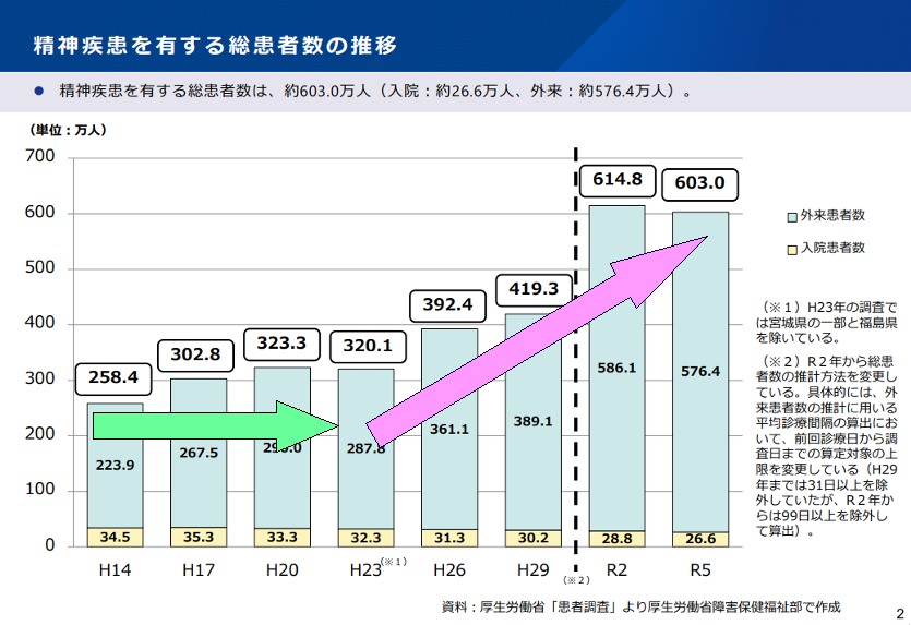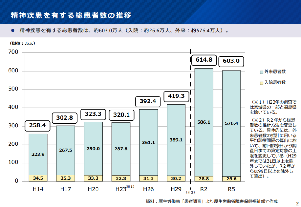 厚労省のデータによると、令和5年の時点で、精神疾患(認知症含む)を抱える方は約603万人にのぼるということが分かります。